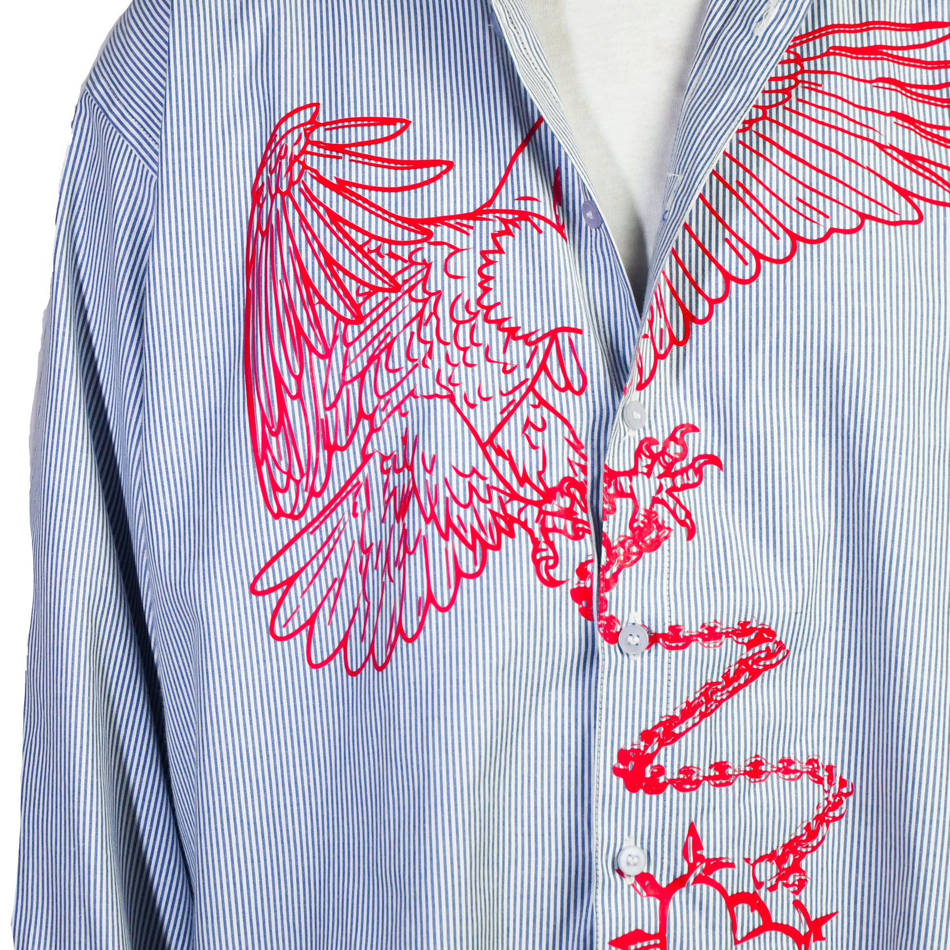 The Chasing Love Shirt flips the classic striped button-down into a bold statement piece. Crafted from premium cotton poplin with a crisp finish, it features a striking red graphic of an eagle entangled in a thorned heart — symbolizing freedom caught in chaos.This piece blends street sensibility with clean tailoring — designed to move from back-alley energy to rooftop confidence